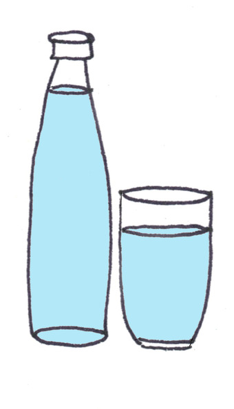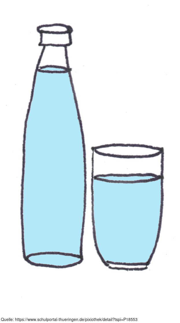 Das Bild zeigt eine gezeichnete Flasche und ein Glas mit Wasser (farbig). Es gehört zur Serie "Ernährungspyramide zum Basteln und Gestalten" und findet u.a. im gleichnamigen Lernobjekt unter https://www.schulportal-thueringen.de/web/guest/media/detail?tspi=18517 Verwendung. Es gelten die Nutzungsbedingungen der Mediothek und Pixiothek.