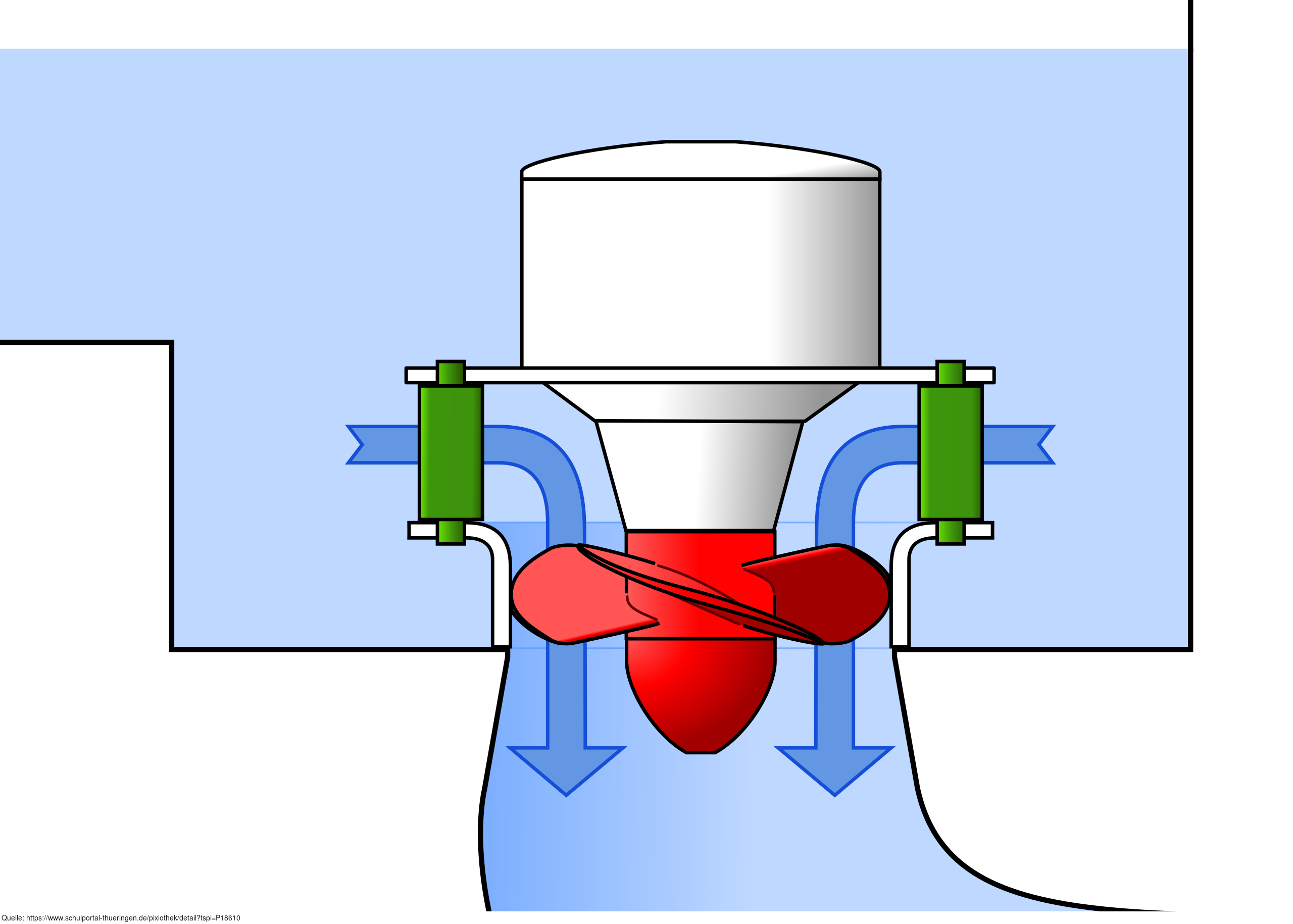 Das Bild gehört zur Serie "Turbinenarten". Es zeigt die Skizze einer DIVE-Turbine (eine Variante der Propellerturbine). Wenngleich verwand ist es keine Kaplan-Turbine da die Laufradschaufeln nicht verstellbar sind.. Das Bild ist unter CC0 lizenziert und kann somit frei verwendet werden.