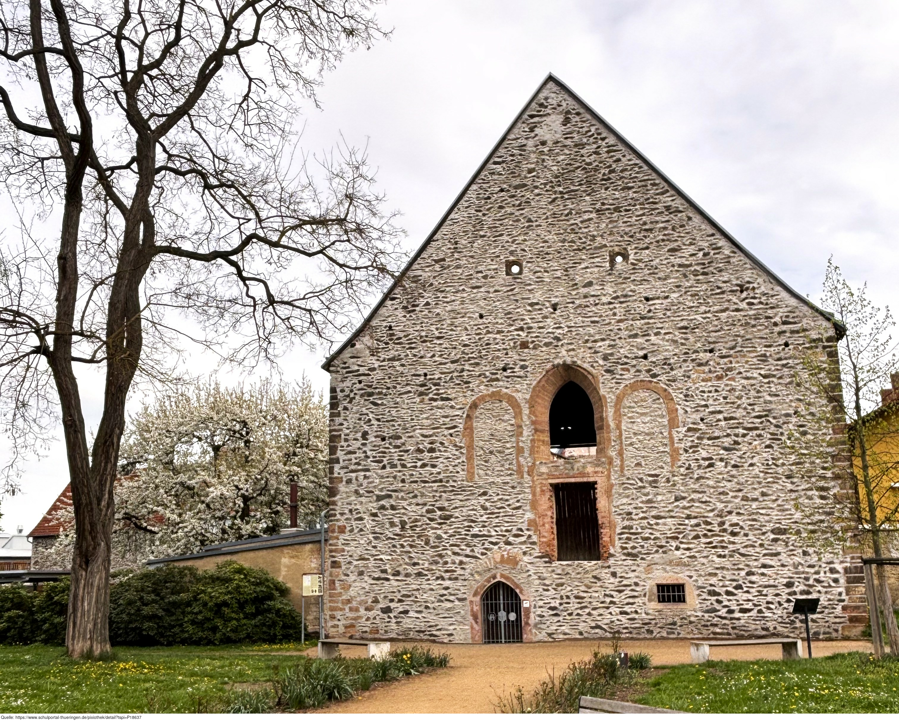 Das Bild zeigt die Ruine des ehemaligen Dominikanerinnen-Nonnenklosters St. Maria Magdalena als Stiftung der Weidaer Vögte aus dem 13. Jahrhundert. Der ursprünglich romanische Kirchenbau wurde aus Bruchsteinen gemauert und erhielt später gotische Spitzbogenfenster. Nach Auflösung des Klosters im 16. Jh. diente die Kirche als Getreidelager.