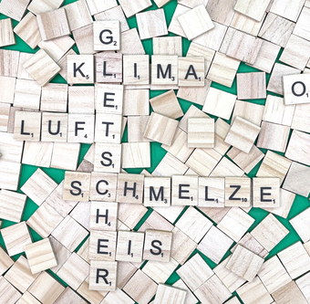 Aus Buchstaben wurden die Begriffe "Gletscher", "Klima", "Luft", "Schmelze" und "Eis" gelegt. Es gelten die Nutzungsbedingungen der Mediothek und Pixiothek.