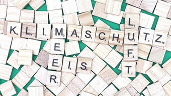 Aus Buchstaben wurden die Begriffe "Klimaschutz", "Meer", "Eis" und "Luft" gelegt. Es gelten die Nutzungsbedingungen der Mediothek und Pixiothek.