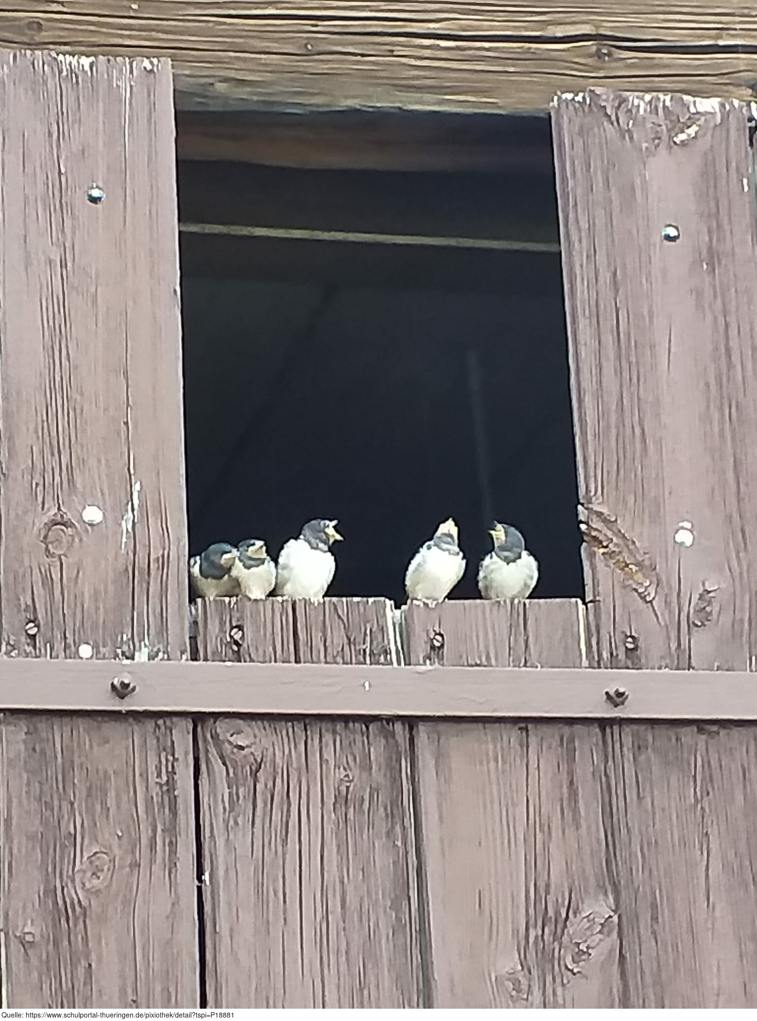 Das Foto gehört zur Serie "Schwalbenfreundliches Haus". Es zeigt junge Rauchschwalben. Das Nest befindet sich in einer Scheune, die für Vögel und Fledermäuse einige offene Durchflugsmöglichkeiten bereithält. Es gelten die Nutzungsbedingungen der Mediothek und Pixiothek.
