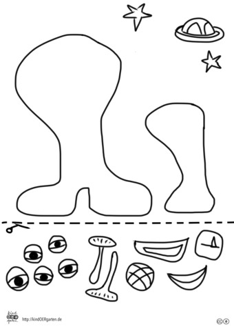 Das Bild zeigt ein Weltallmotiv mit Alien (s/w) und kann als Schnipselbildvorlage für Kinder im Kindergarten bzw. Elementarbereich dienen. Das Bild ist unter CC0 lizenziert und kann somit frei verwendet werden. Es ist neben weiteren Bildern auch hier zu finden: https://kindoergarten.wordpress.com/
