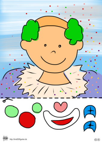 Das Bild zeigt einen Clown (farbig) und kann als Schnipselbildvorlage für Kinder im Kindergarten bzw. Elementarbereich dienen. Das Bild ist unter CC0 lizenziert und kann somit frei verwendet werden. Es ist neben weiteren Bildern auch hier zu finden: https://kindoergarten.wordpress.com/