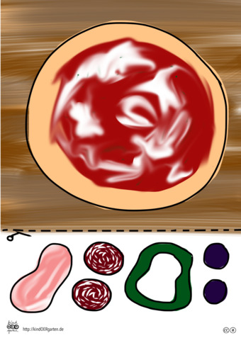 Das Bild zeigt eine Pizza (farbig) und kann als Schnipselbildvorlage für Kinder im Kindergarten bzw. Elementarbereich dienen. Das Bild ist unter CC0 lizenziert und kann somit frei verwendet werden. Es ist neben weiteren Bildern auch hier zu finden: https://kindoergarten.wordpress.com/
