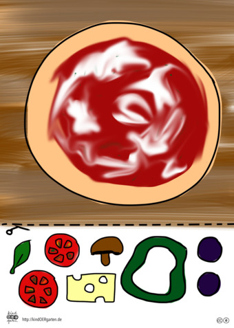 Das Bild zeigt eine vegetarische Pizza (farbig) und kann als Schnipselbildvorlage für Kinder im Kindergarten bzw. Elementarbereich dienen. Das Bild ist unter CC0 lizenziert und kann somit frei verwendet werden. Es ist neben weiteren Bildern auch hier zu finden: https://kindoergarten.wordpress.com/