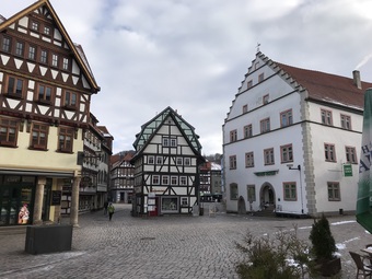 Das Foto gehört zur Serie "Schmalkalden". Es zeigt die Mohrengasse und den Soldatensprung. Die Häuser der Mohrengasse waren zunächst der Salzbrücke zugeordnet. Ab 1907 wurde der Name Mohrengasse verwendet. Die Bezeichnung bezog sich aller Wahrscheinlichkeit nach auf die sich seit 1610 dort befindende Mohrenapotheke. Auch der Soldatensprung gehörte bis 1907 zur Salzbrücke. Der Name hatte seinen Ursprung in einer umgangssprachlichen Bezeichnung, die der Mundartautor Adolf Frank 1935 mit "där Sälldoadeschieß" wiedergibt. Ein zwischen 1831 und 1848 in Schmalkalden stationiertes kurhessisches Feldjägerkorps hatte hier nämlich seine Latrine.