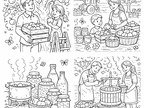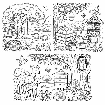 Das Bild zeigt Motive zum Landleben im Obstgarten mit Tieren. Es wurde mit Hilfe der KI "Coloring Book Hero" erstellt.
