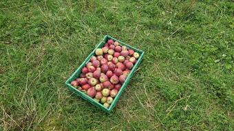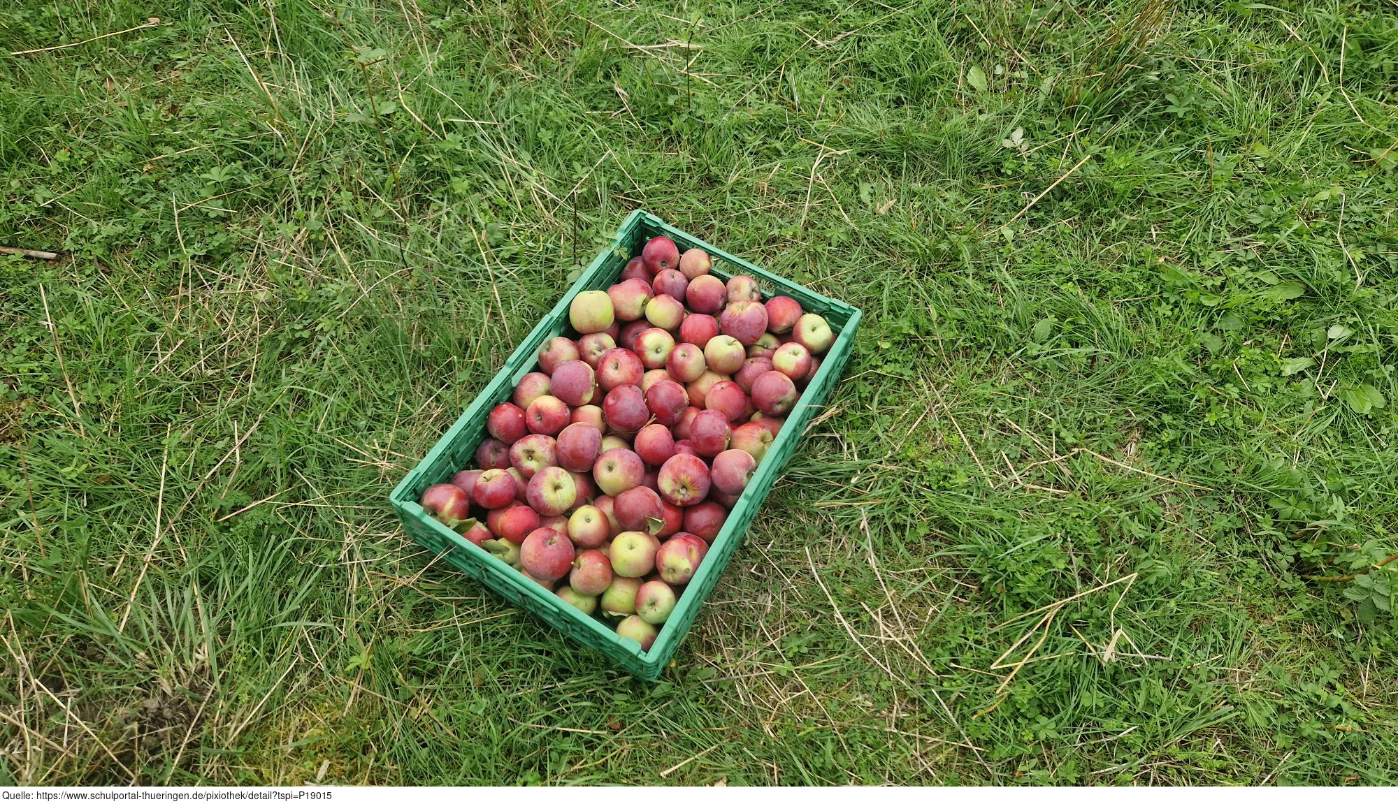 Das Bild zeigt eine Obstkiste mit Äpfeln auf dem ApfelGut Erfurt. Es gelten die Nutzungsbedingungen der Mediothek und Pixiothek.