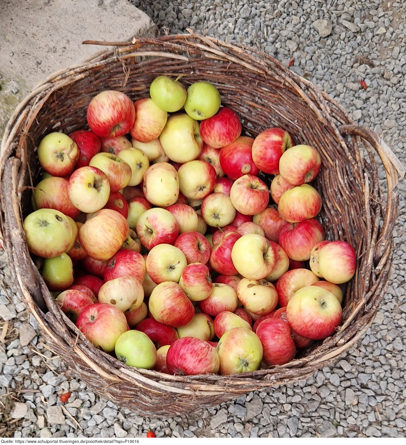 Das Bild zeigt einen geflochtenen Korb mit Äpfeln auf dem ApfelGut Erfurt. Es gelten die Nutzungsbedingungen der Mediothek und Pixiothek.