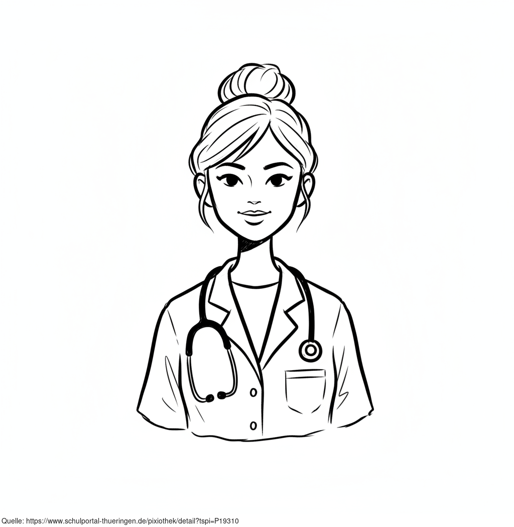 Das Bild zeigt eine gezeichnete Ärztin mit Stethoskop. Das Bild wurde mittels einer KI (Gemini) erstellt und ist unter CC0 lizenziert. Weitere Bilder aus Herrn Emrich-Försters Bild-Archiv findet man hier: https://pix.foerster.rocks​​​​​/