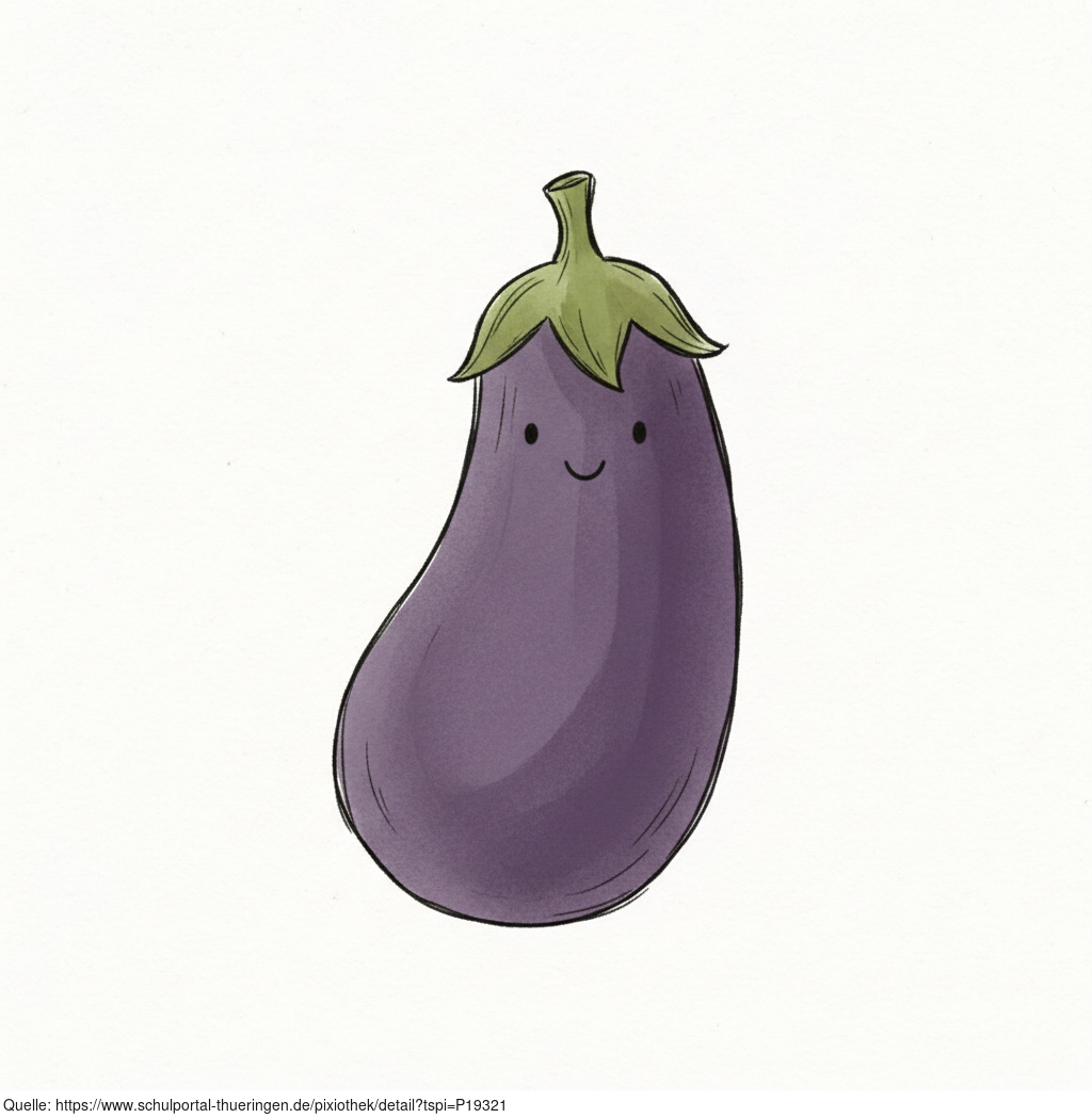 Das Bild zeigt eine gezeichnete Aubergine. Das Bild wurde mittels einer KI (Gemini) erstellt und ist unter CC0 lizenziert. Weitere Bilder aus Herrn Emrich-Försters Bild-Archiv findet man hier: https://pix.foerster.rocks/