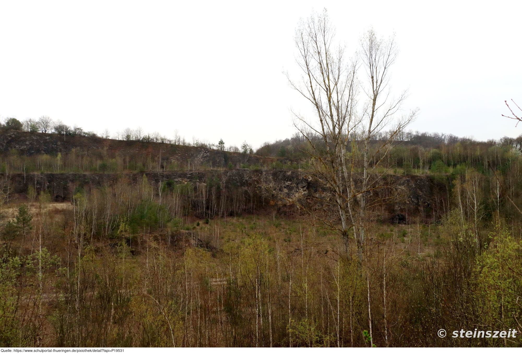Das Bild zeigt den ehemaligen Steinbruch Buchenberg im Gebiet der Zechsteinriffe der Orlasenke bei Krölpa, Ranis und Pößneck im Saale-Orla-Kreis. Hier wurde im Zeitraum von 1943 bis 1978 Stahlwerks- und Düngekalk gewonnen. 1996 wurde der Buchenberg unter Naturschutz gestellt und ist ein weitestgehend ungestörter Trockenlebensraum u.a. für Orchideen wie die Bienen-Ragwurz (Ophrys apifera).