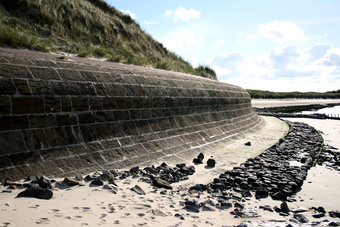 Abgebildet ist eine gemauerte Steinwand vorden Dünen.