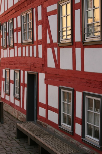Das Foto gehört zur Serie "Schmalkalden". Es zeigt das Fachwerk eines Hauses in der Altstadt. Es gelten die Nutzungsbedingungen der Mediothek und Pixiothek.