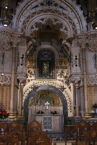 Das Bild gehört zu einer Serie mit ausgewählten Fotografien vom Kloster Santa Maria de Montserrat, nordwestlich von Barcelona. Zu sehen ist die schwarze Madonna vom hinteren Kirchenraum aus gesehen. Berühmt ist die Abtei durch die aus dem 12. Jahrhundert stammende Mariendarstellung „Unsere Liebe Frau von Montserrat“, oft als Schwarze Madonna bezeichnet. Darüber hinaus hat sich Montserrat als bedeutendes Zentrum der katalanischen Kultur einen Namen gemacht. Es gelten die Nutzungsbedingungen der Mediothek und Pixiothek.
