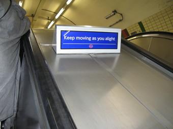 London: Hinweisschild auf der Rolltreppe