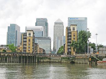 Das Foto gehört zur Serie London 2016. Es zeigt die Schleuse zwischen Themse und Blackwall Basin, dahinter die Hochhäuser der Canary Wharf in den Docklands. Es gelten die Nutzungsbedingungen der Mediothek und Pixiothek.
