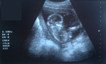 Ultraschallaufnahme eines menschlichen Embryos in der 14. Schwangerschaftswoche. Es gelten die Nutzungsbedingungen der Mediothek und Pixiothek.