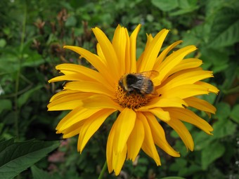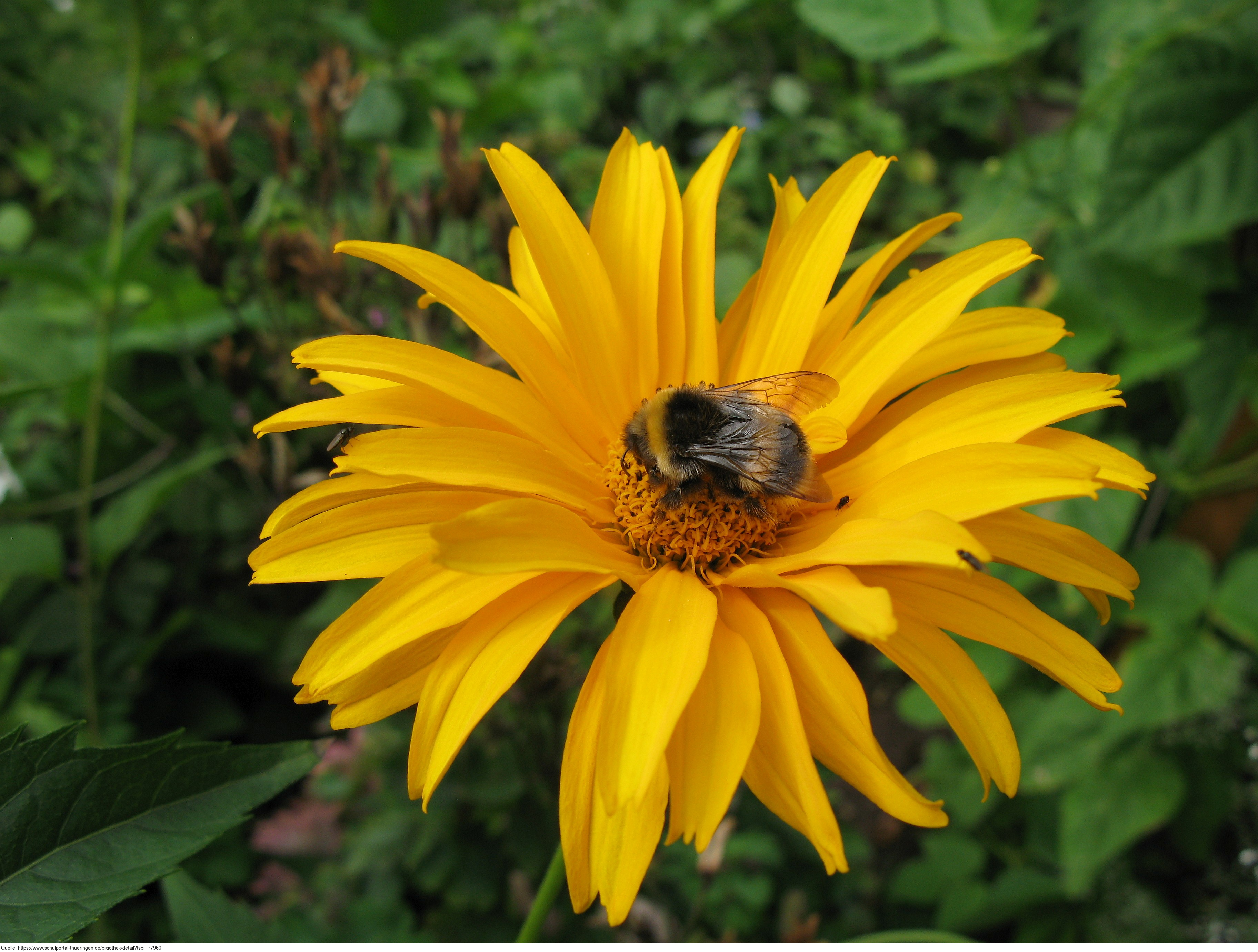 Das Foto gehört zur Serie Blumen im Garten. Es zeigt eine Ringelblume (Calendula). Sie ist einjährig und wächst am besten in Gruppen. Die Ringelblume ist nicht winterhart, wächst aber im Folgejahr durch ihren winterharten Samen von selbst wieder. Calendula officinalis war die Heilpflanze des Jahres 2009. Hier sucht eine Erdhummel nach Nektar. Es gelten die Nutzungsbedingungen der Mediothek und Pixiothek.