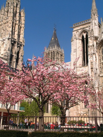 Das Foto gehört zur Serie "Kathedrale von Rouen". Es zeigt die Türme der Westfassade: Butterturm und Tour Saint Romain von Süden. Es gelten die Nutzungsbedingungen der Mediothek und Pixiothek.