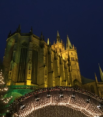 Abgebildet ist der beleuchtete Erfurter Dom bei Nacht, aufgenommen zum Weihnachtsmarkt 2018. Es gelten die Nutzungsbedingungen der Mediothek und Pixiothek.