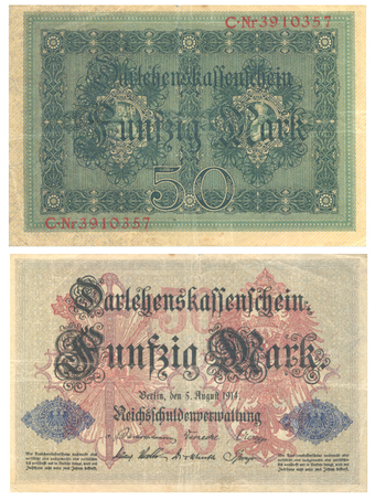 Das Foto gehört zur Serie "Währungen im Deutschen Kaiserreich 1914 bis 1918". Es zeigt einen Darlehenskassenschein über "Fünfzig Mark" vom 05. August 1914. Es gelten die Nutzungsbedingungen der Mediothek und Pixiothek.