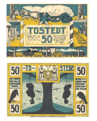 Das Foto gehört zur Serie "Zahlungsmittel in der Weimarer Republik (1918-1933)". Es zeigt einen Gutschein über 50 Pfennige der Gemeinde Tostedt vom 1921. Es gelten die Nutzungsbedingungen der Mediothek und Pixiothek.