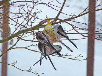 Das Foto gehört zur Serie "Vögel im Winter". Es zeigt Schwanzmeisen am Meisenknödel. Es gelten die Nutzungsbedingungen der Mediothek und Pixiothek.