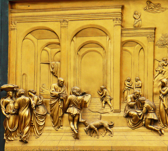 Das Foto gehört zur Serie "Paradiestür am Baptisterium von Florenz". Es zeigt Jakob und Esau, ein Bronzerelief von Lorenzo Ghiberti. Es ist links in der dritten Reihe der zehn Bildtafeln in seine Paradiestür (auch Paradiespforte genannt) eingebunden. Es gelten die Nutzungsbedingungen der Mediothek und Pixiothek.