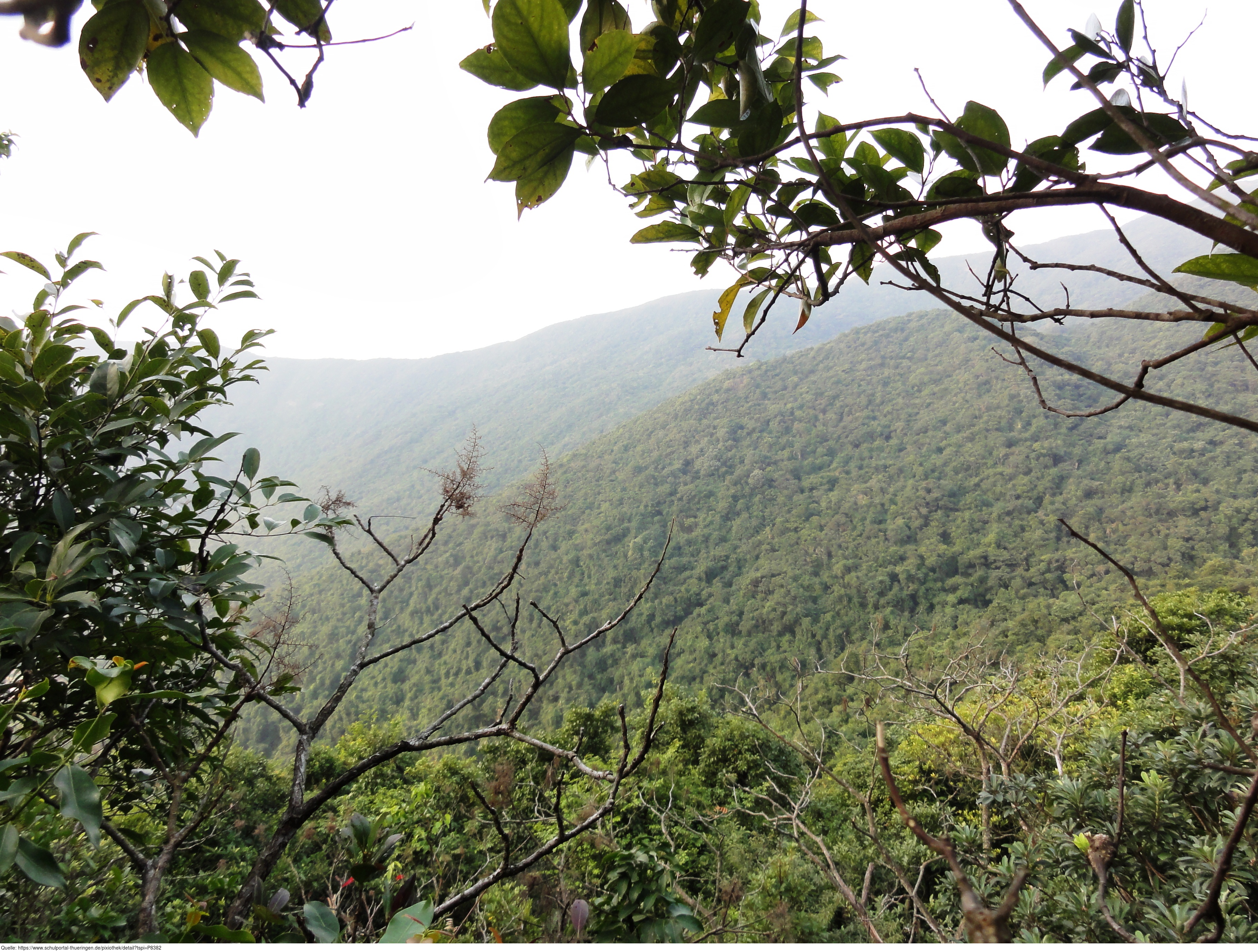 Das Foto gehört zur Serie "Hong Kong Trail". Es zeigt den Blick vom Weg auf die Berge bei Hong Kong. Es gelten die Nutzungsbedingungen der Mediothek und Pixiothek.