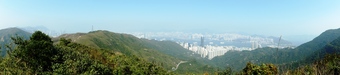 Das Foto gehört zur Serie "Hong Kong Trail". Es zeigt ein Panoramabild von Hong Kong und den umliegenden Bergen. Es gelten die Nutzungsbedingungen der Mediothek und Pixiothek.