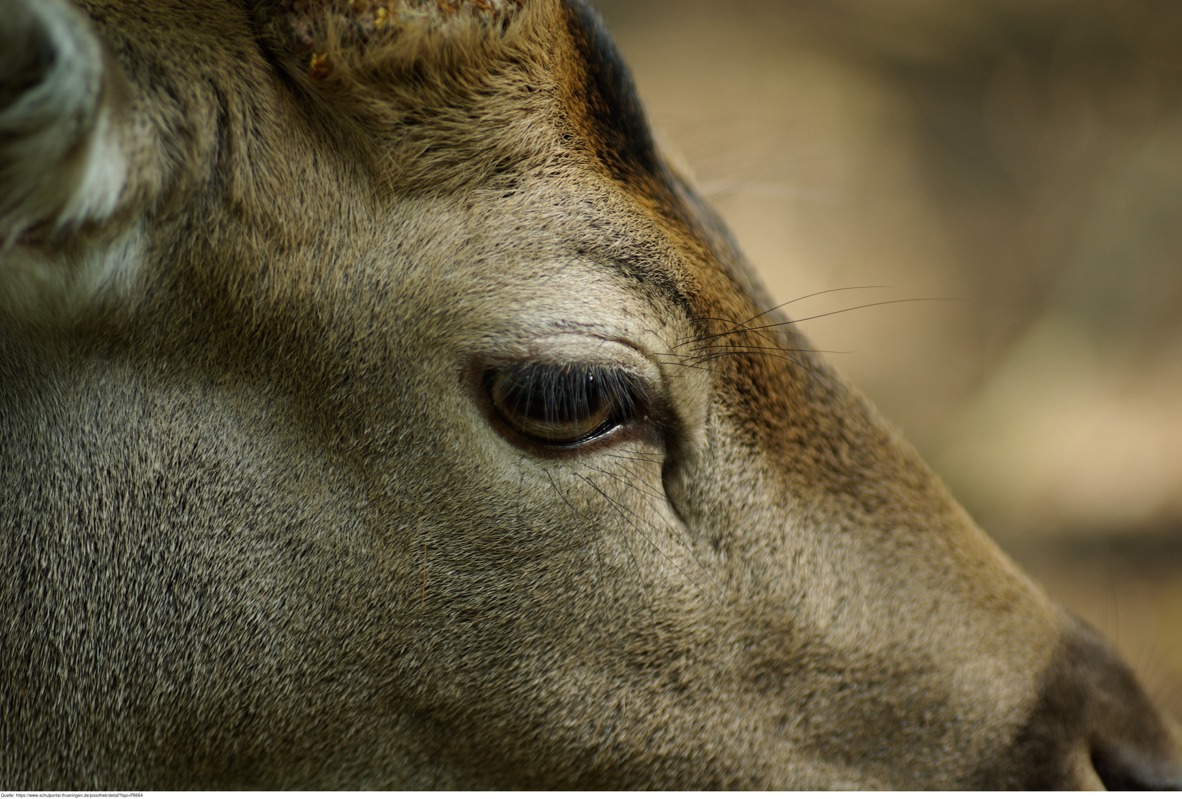 Das Foto zeigt ein Detail vom Kopf (Auge) eines Damhirschs (Dama dama). Das Bild ist unter CC0 lizenziert und kann somit frei verwendet werden.