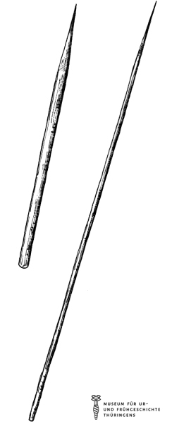 Das Bild gehört zur Serie "Zeichnungen Steinzeit - Museum für Ur- und Frühgeschichte Thüringens". Abgebildet sind Stoßlanze und Wurfspeer als typische Jagdwaffen der Jäger und Sammler. Es gelten die Nutzungsbedingungen der Mediothek und Pixiothek.