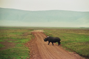 Das Bild wurde in Tansania aufgenommen. Es zeigt ein Nashorn beim Überqueren der Straße. Es gelten die Nutzungsbedingungen der Mediothek und Pixiothek.