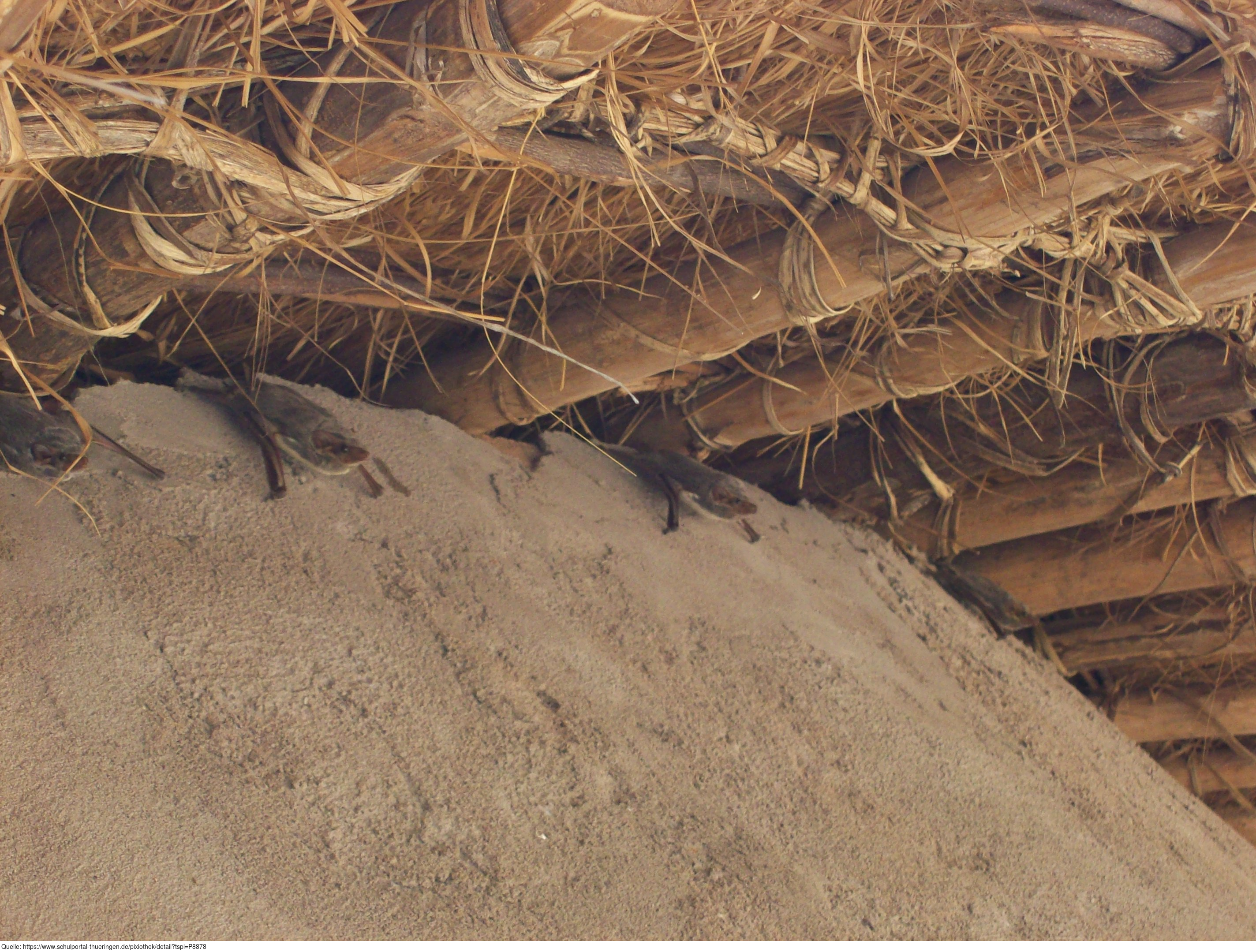Das Bild wurde in Tansania aufgenommen. Es zeigt Flughunde unter einem Dach sitzend. Es gelten die Nutzungsbedingungen der Mediothek und Pixiothek.