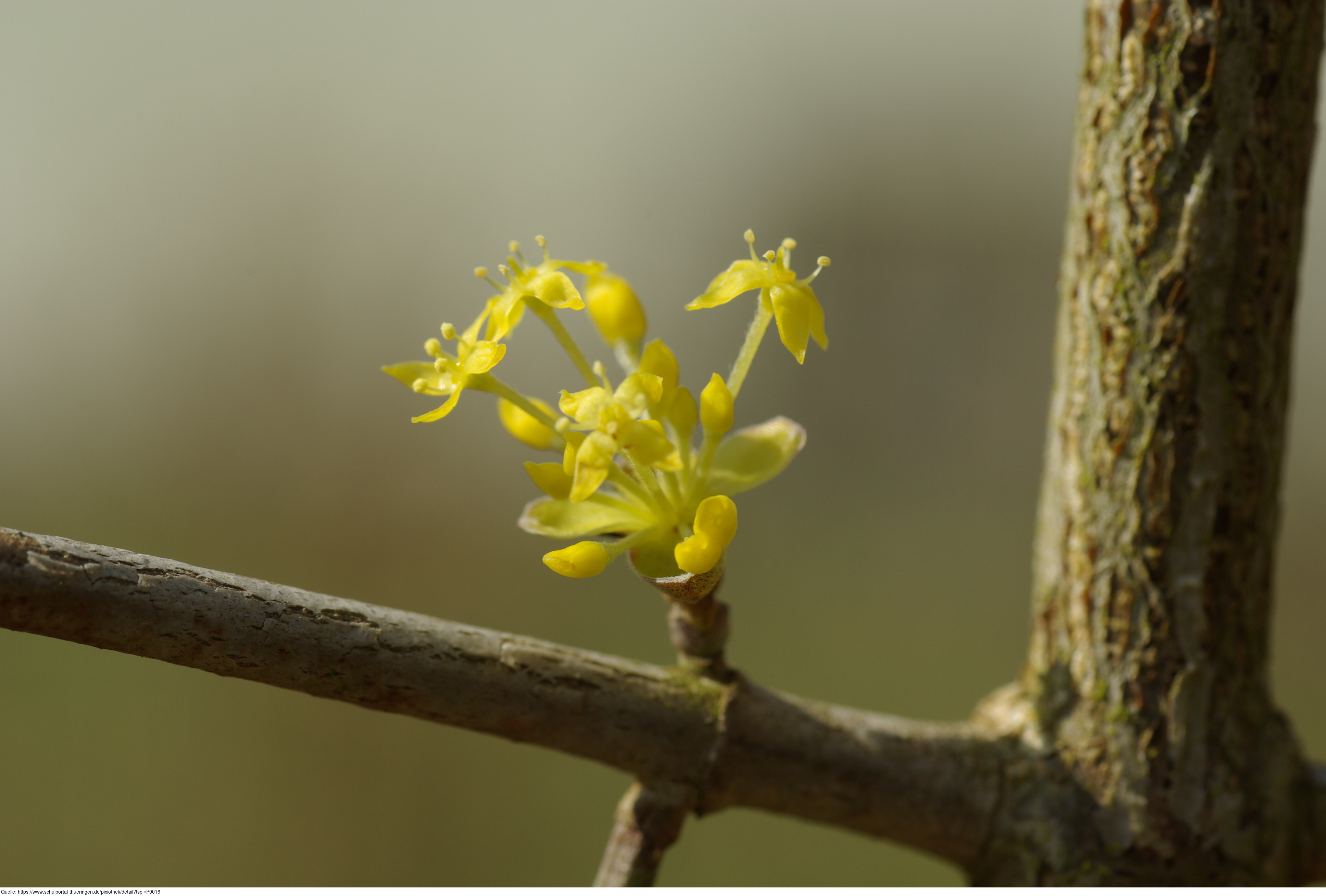 Das Foto gehört zur Serie "Laubbäume". Es zeigt Blüten einer Kornelkirsche (Cornus mas), auch Herlitze, Dürlitze, Hirlnuss genannt. Das Bild ist unter CC0 lizenziert und kann somit frei verwendet werden.