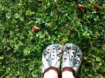 Mit Gartenschuhen im Rasen