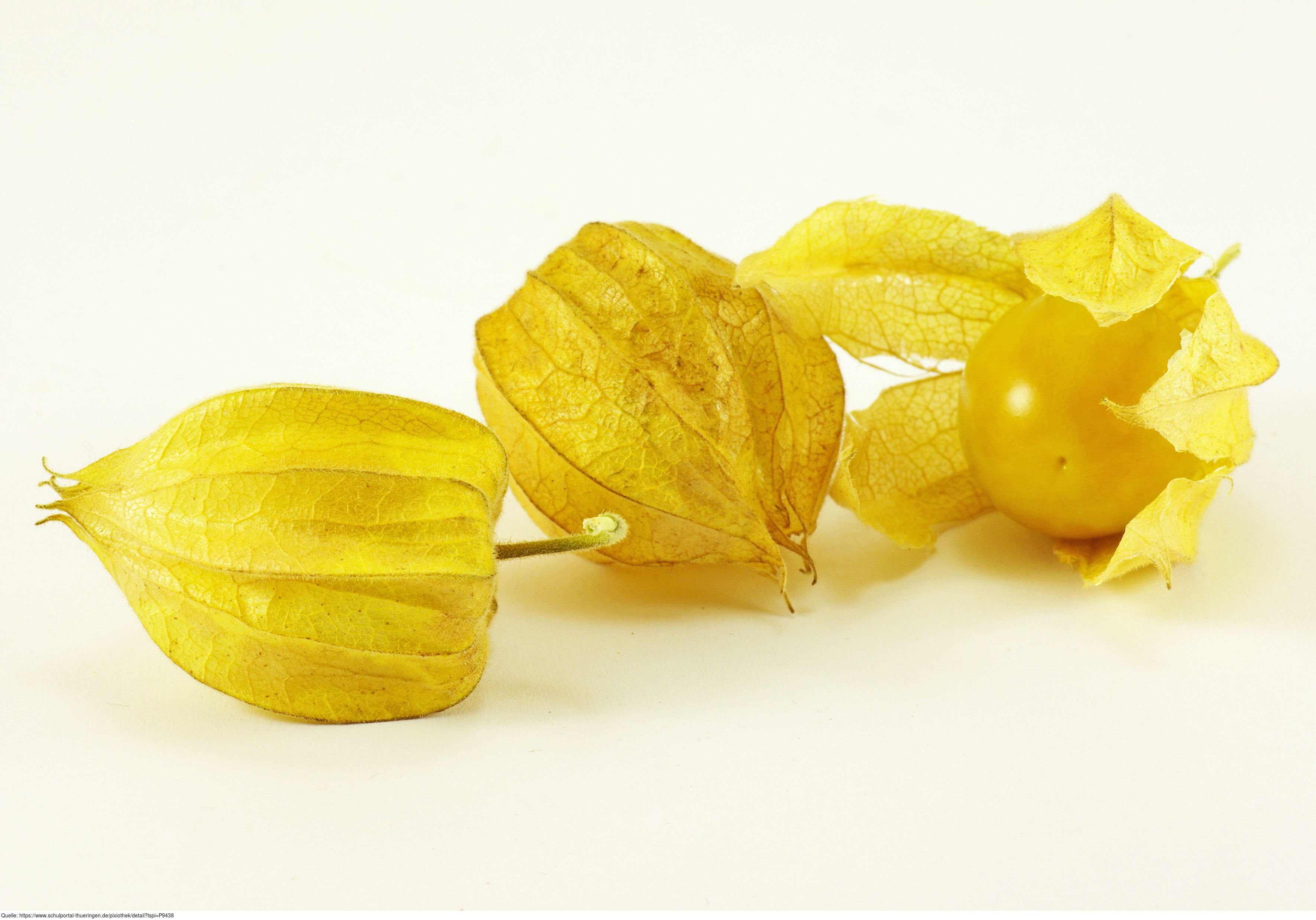 Das Foto gehört zur Serie "Obst". Es zeigt eine Kapstachelbeere (Physalis peruviana), auch Andenbeere, Andenkirsche und Peruanische Blasenkirsche genannt. Das Bild ist unter CC0 lizenziert und kann somit frei verwendet werden.
