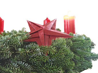 Das Foto gehört zur Serie "Advent". Es zeigt Kerzen und einen Deko-Stern auf einem Adventskranz. Das Bild ist unter CC0 lizenziert und kann somit frei verwendet werden.