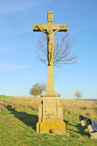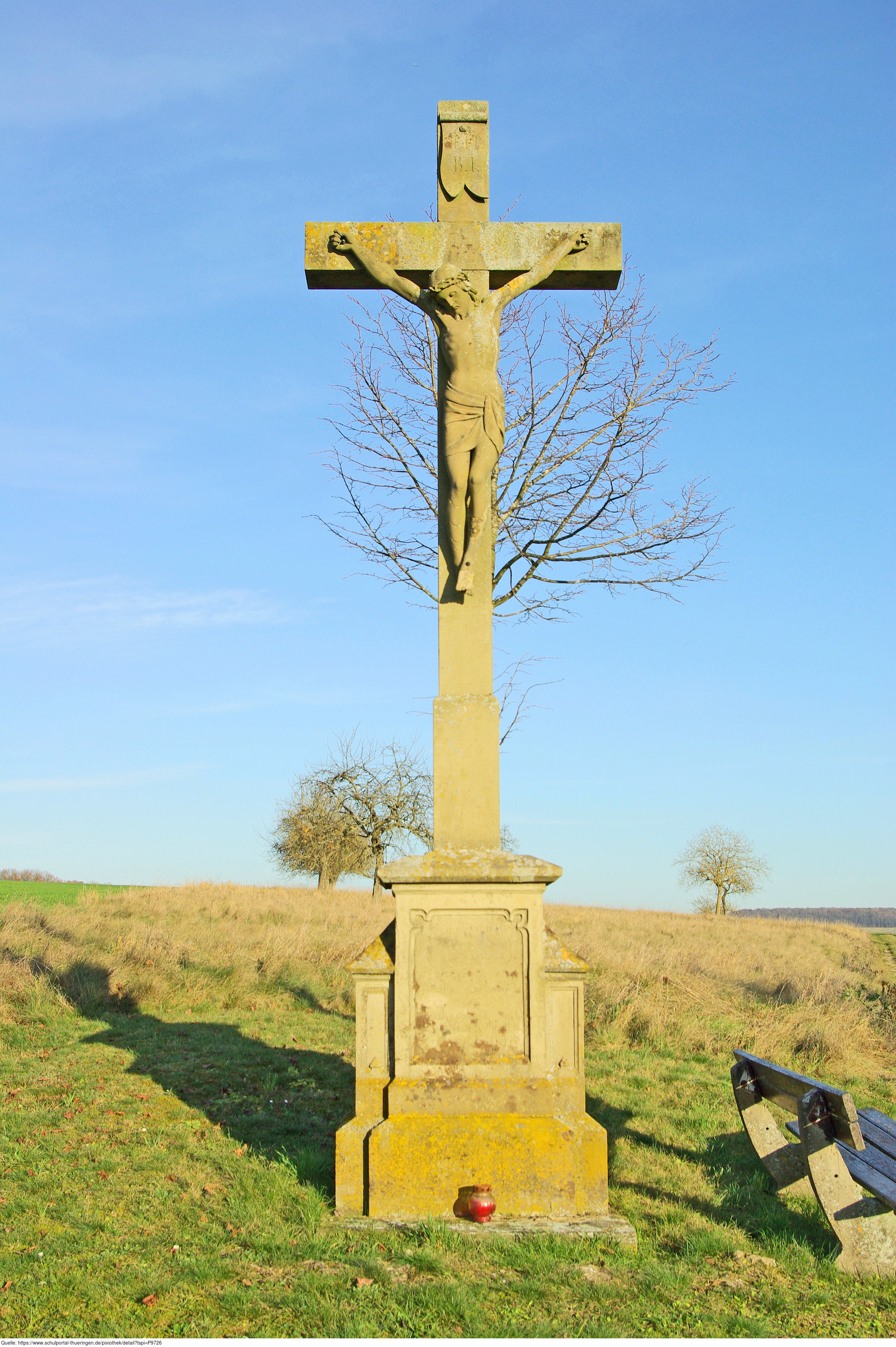 Das Bild gehört zur Serie "Religion". Es zeigt ein Flurkreuz. Flurkreuze mit Darstellung des gekreuzigten Christus heißen Kruzifixe. Das Bild ist unter CC0 lizenziert und kann somit frei verwendet werden.