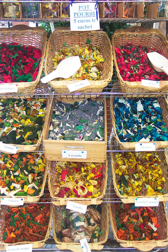 Das Bild gehört zur Serie "Provence und Côte d’Azur". Es zeigt ein Verkaufsangebot verschiedener getrockneter Pflanzen zur Gewinnung von Duftstoffen oder als Heilpflanzen in Grasse. Das Bild ist unter CC0 lizenziert und kann somit frei verwendet werden.