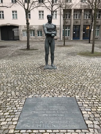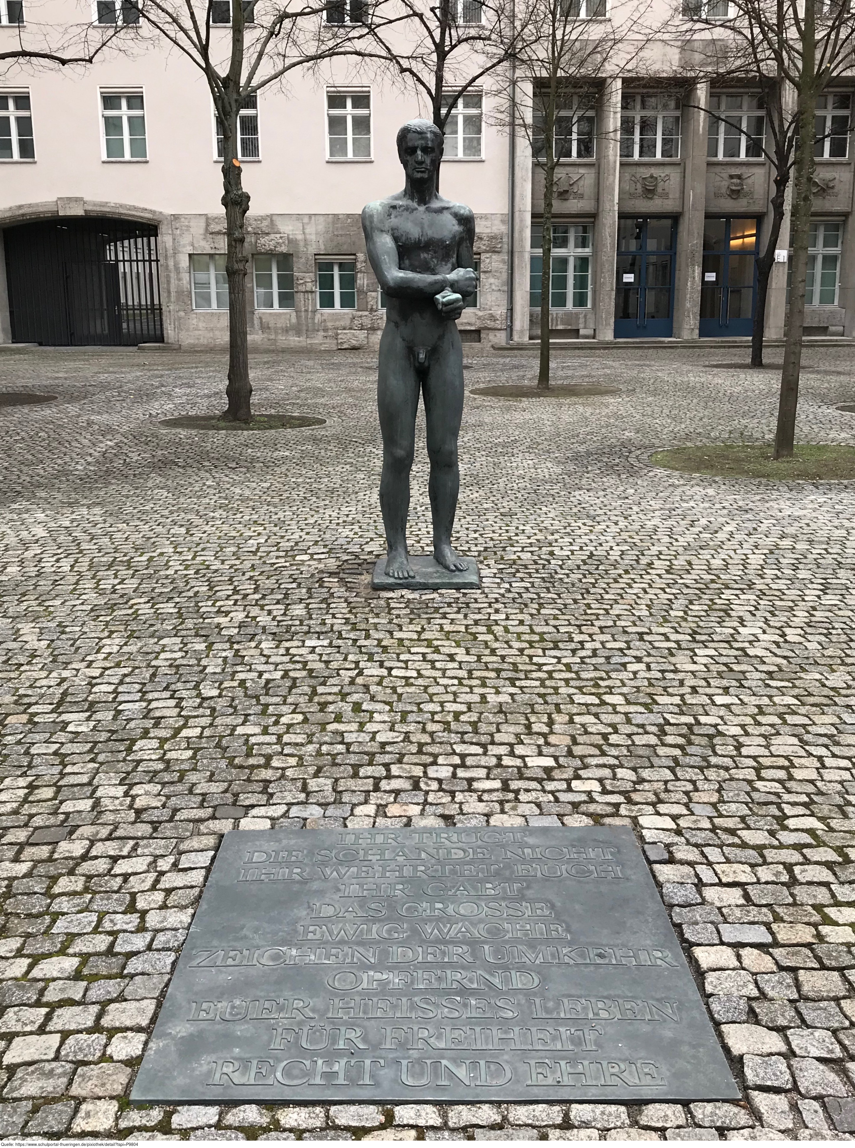 Innenhof des Bendlerblocks mit Gedenktafeln, Denkmal von Richard Scheibe 1953: Junger Mann mit gebundenen Händen. Es gelten die Nutzungsbedingungen der Mediothek und Pixiothek.
