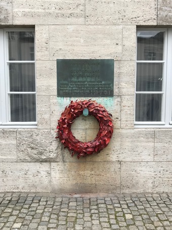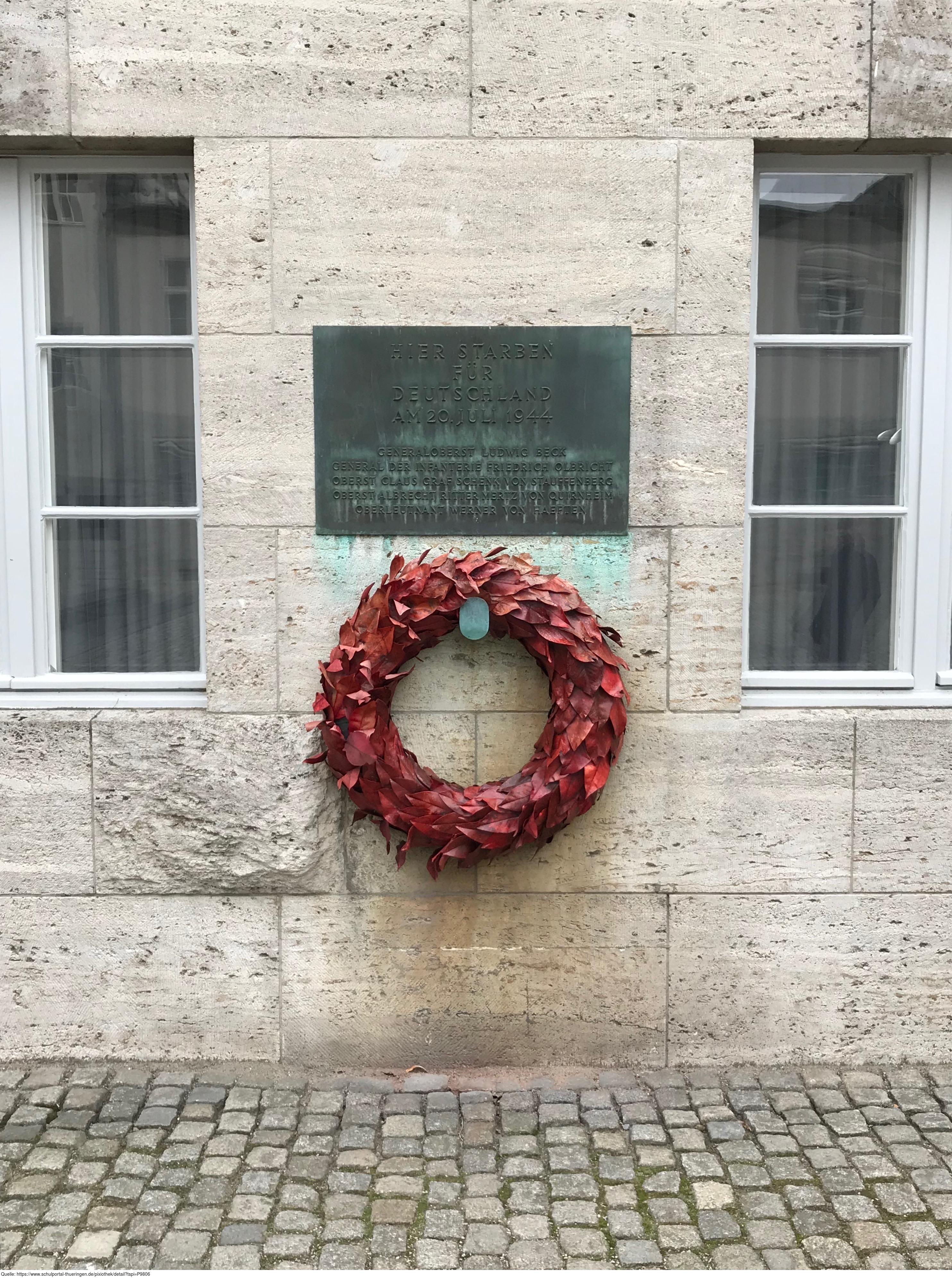 Innenhof des Bendlerblocks mit Gedenktafeln, Denkmal von Richard Scheibe 1953: Junger Mann mit gebundenen Händen. Es gelten die Nutzungsbedingungen der Mediothek und Pixiothek.