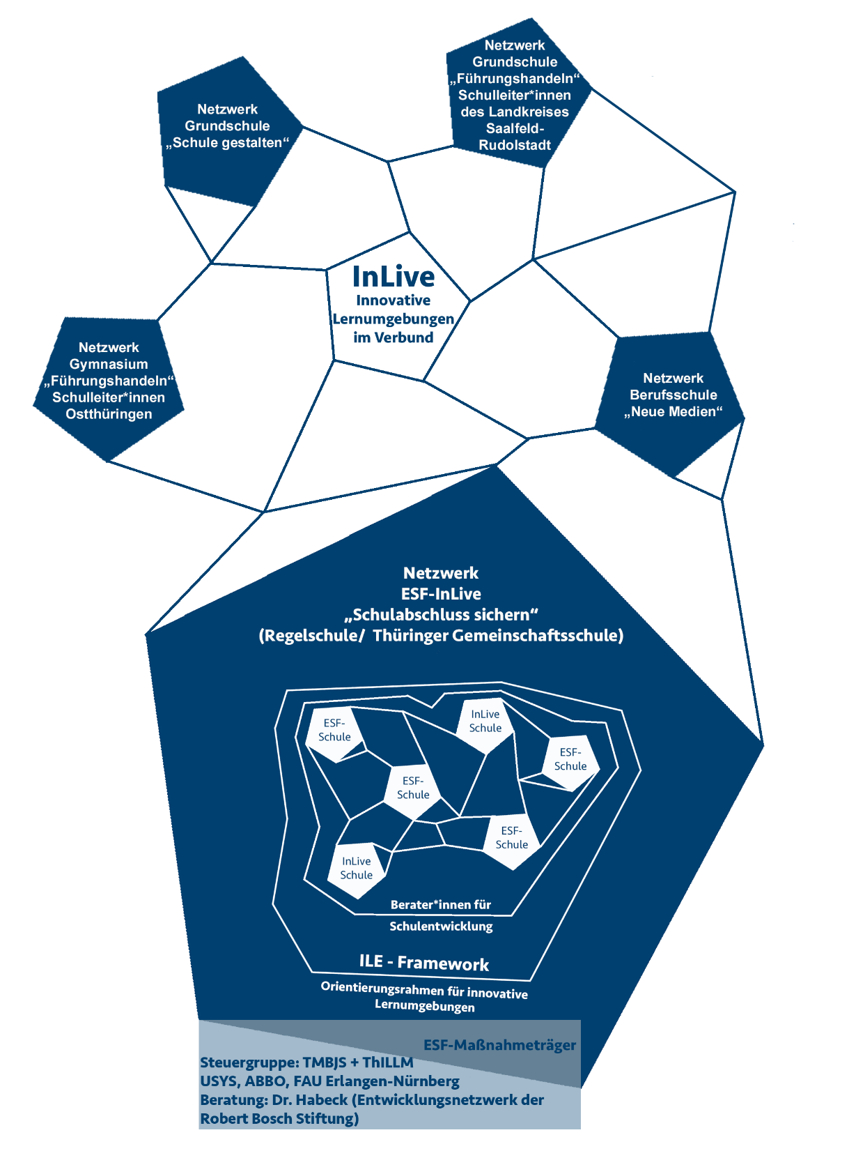 Das ESF-InLiVe-Netzwerk setzt sich aus sechs Regel- bzw. Gemeinschaftsschulen in Südthüringen zusammen, die gemeinsam am übergeordneten Ziel der Senkung des Anteils an Schülerinnen und Schülern ohne Schulabschluss arbeiten. Vier der sechs Netzwerkschulen des ESF-InLiVe-Netzwerks "Schulabschluss sichern" erhalten finanzielle Förderung des Thüringer Ministeriums für Bildung, Jugend und Sport (TMBJS) aus Mitteln des Europäischen Sozialfonds (ESF).