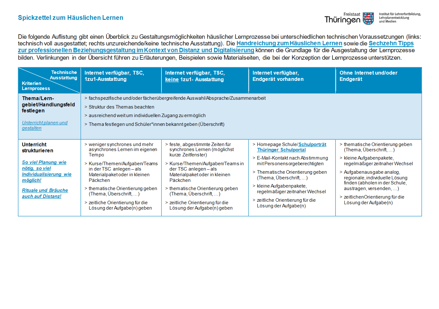 Der Spickzettel zum häuslichen Lernen gibt Anregungen zur Planung und Durchführung von ortsunabhängigen Lernprozessen.