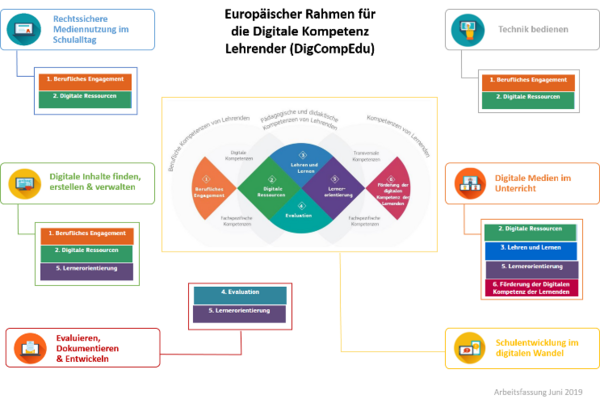 Eine gute Orientierung über die notwendigen digitalen Kompetenzen gibt der Europäische Rahmen für die Digitale Kompetenz Lehrender (DigCompEdu). Demnach benötigen Lehrkräfte Kompetenzen in folgenden Bereichen: